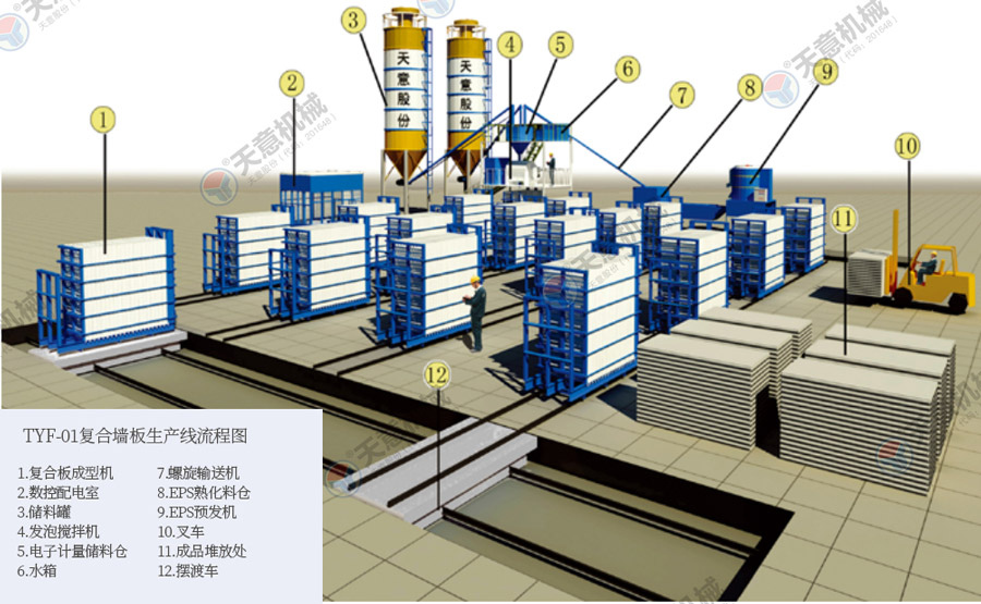 TY12型墻板生產(chǎn)線包括:墻板成型機(jī)、整體穿抽管系統(tǒng)、發(fā)泡系統(tǒng)、水箱、電子計(jì)量儲料倉、螺旋上料輸送機(jī)、儲料罐、螺旋輸送機(jī)、EPS熟化料倉、硫化干燥床、EPS預(yù)發(fā)機(jī)、數(shù)控配電室、發(fā)泡攪拌機(jī)、整體出板系統(tǒng)、叉車、成品堆放區(qū)、擺渡車。