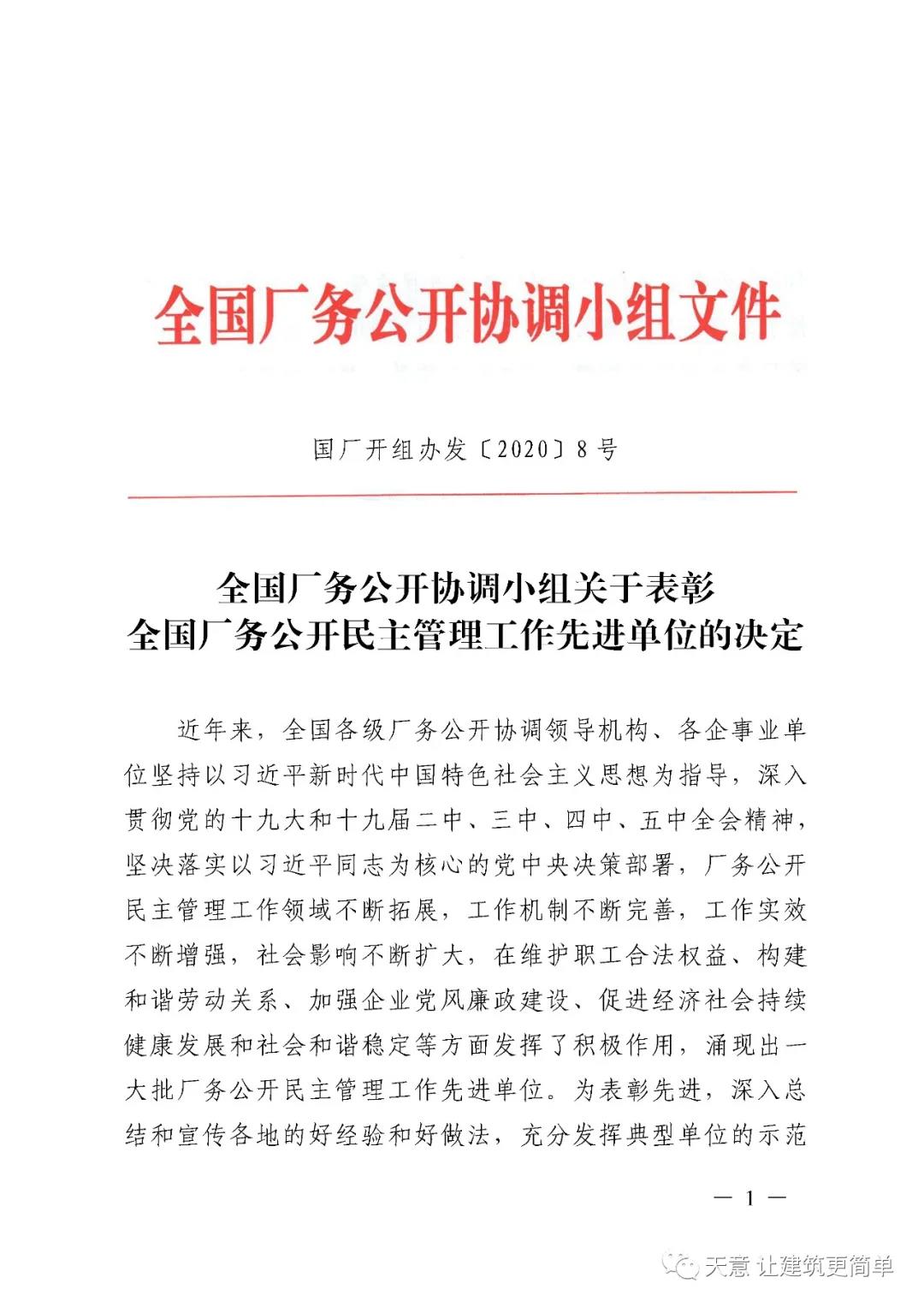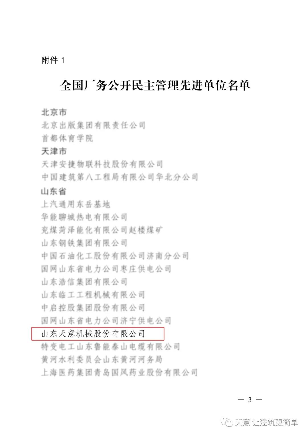 喜訊丨祝賀天意機(jī)械被授予“全國廠務(wù)公開民主管理先進(jìn)單位”稱號