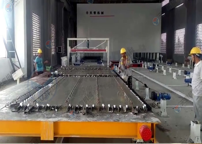 PC環(huán)形疊合板/內(nèi)墻板生產(chǎn)線的主要設(shè)備包括雙梁橋式起重機(jī)、清理機(jī)、脫模劑噴涂機(jī)、布料機(jī)、振動臺、趕平機(jī)、拉毛裝置、預(yù)養(yǎng)窯、抹光機(jī)、碼垛車、養(yǎng)護(hù)窯、翻轉(zhuǎn)機(jī)、擺渡車、支撐滾輪、驅(qū)動輪、模臺和成品運(yùn)輸車等。